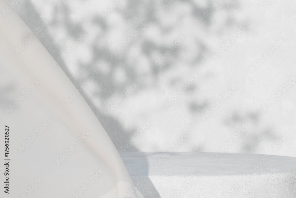 White concrete empty table, organic curtain and plant shadow on cement wall. Summer exterior scene for product placement mockup. Neutral minimal aesthetic.