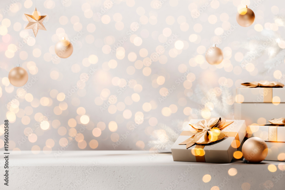 Christmas background with golden christmas presents and ornaments on empty table. New year holiday present box with bokeh lights. Minimal winter festive mockup.