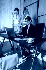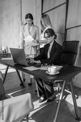 Three professional businesswomen collaborating on a project, one typing on a laptop while two colleagues review documents, working together in a modern office environment