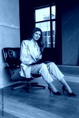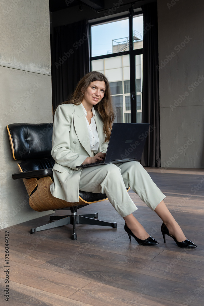 Professional businesswoman in a pantsuit sits confidently in a modern office chair, working on a laptop by a window, focused and poised in a contemporary corporate setting