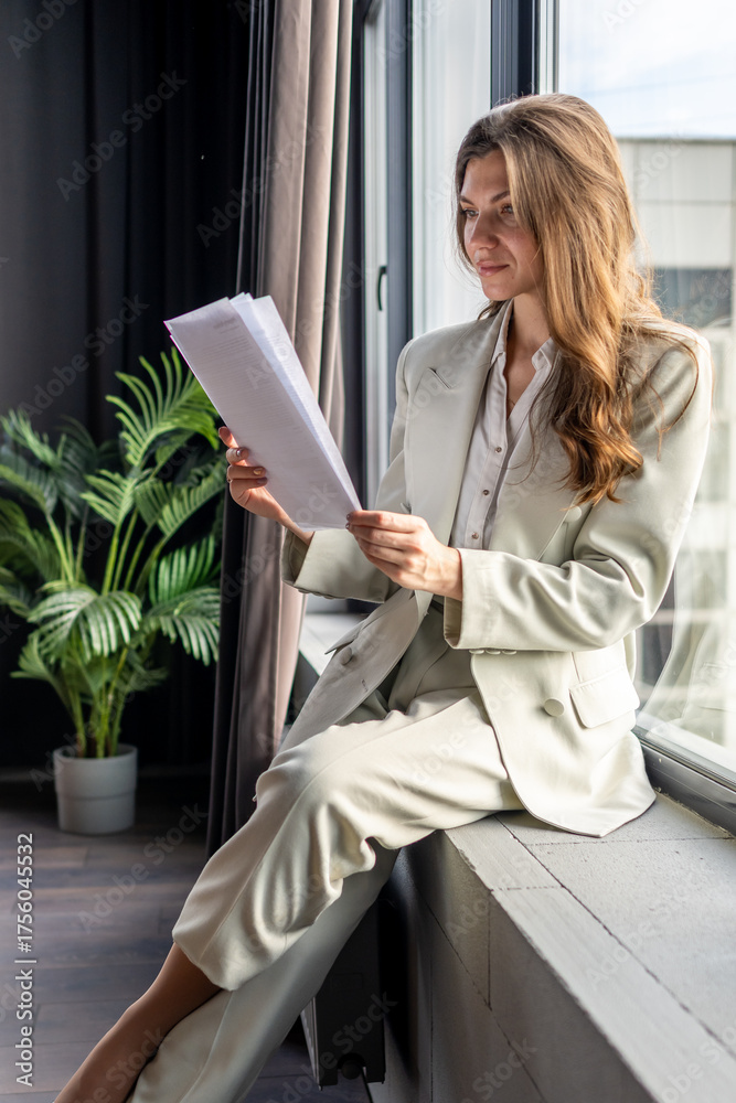 Businesswoman reviewing important contracts while sitting on a window sill in her modern office, focusing on important details for financial success and professional growth