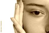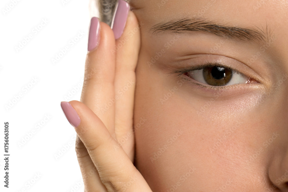 Studio shot extreme closeup of young woman touching and stretching skin near eye on white background.