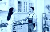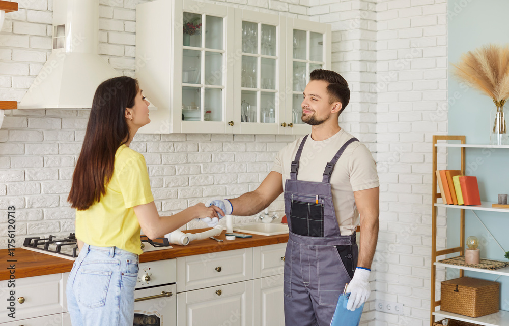 Handshake of plumber and customer at home kitchen, woman greeting professional repairman to repair sink, fix plumbing. Satisfied client and handyman shake hands. Maintenance service, good work concept