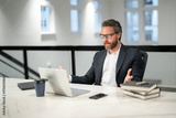 Middle aged businessman working with laptop in office. Hispanic business man using laptop. Millennial man using laptop at office workplace. Ceo manager office worker business people working at office.