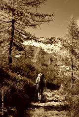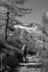 A woman hiking in the Ticino mountains on a beautiful, autumn day.