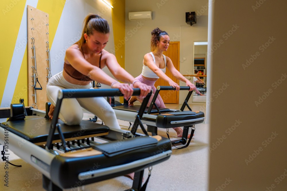 Two young women engaging in a challenging pilates reformer workout, strengthening core muscles, improving flexibility, and enhancing overall fitness in a professional studio environment