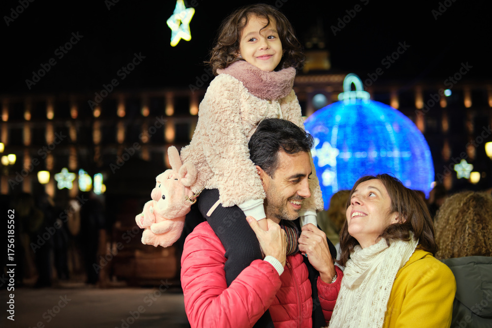 Father carrying daughter on shoulders in festive Christmas square at night