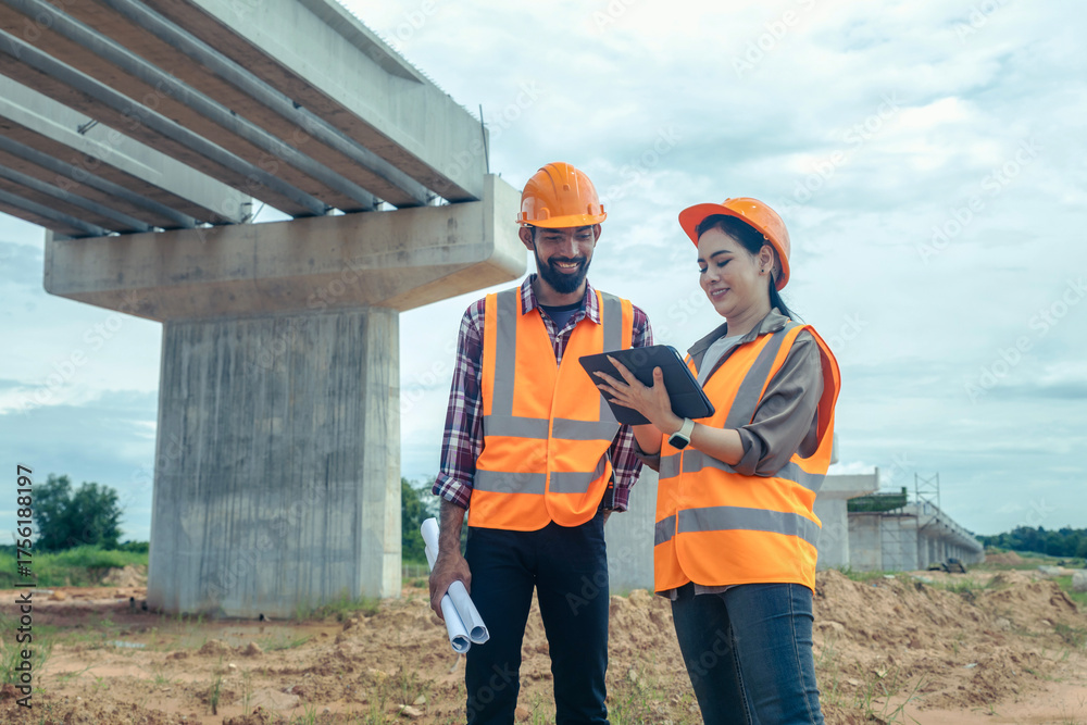 Two Asian male and female engineers work at a motorway bridge construction site. Civil engineers inspect the railway crossing construction using a digital tablet.