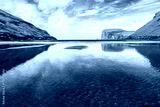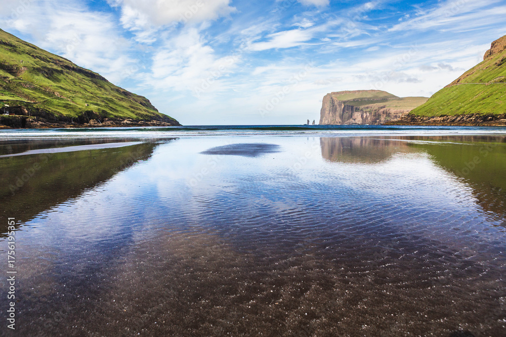 Reflections on the Black Sand Beach of Tjornuvik, Faroe Islands