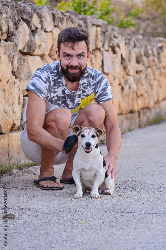 Owner crouching and brushing Jack Russell Terrier on quiet street by stone wall, coat care and deshedding routine, calm pet grooming moment