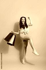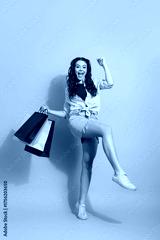 Happy young woman enjoying shopping experience with colorful bags, dressed casually in trendy clothes on pink background