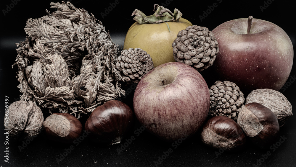 A composition of typically autumnal fruits such as walnuts, enhancing their beauty and detail.