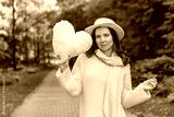 Female model in pastel pink hat and scarf lifts a plush heart while standing on a tree-lined park path with autumn foliage