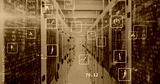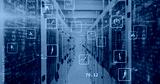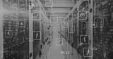 Streaming binary code across long server racks corridor inside data center, displaying energy icons