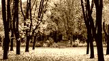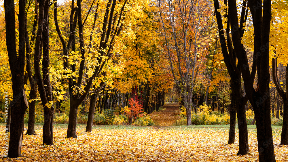 Autumn yellow-gold landscape in a park on a sunny morning