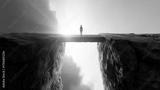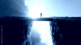 A determined businessperson walks a bridge of light across cliffs, symbolizing challenge and growth.