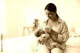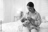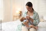 Mother feeding her newborn baby with bottle on bed at home. Space for text