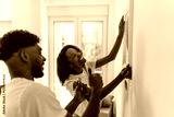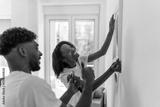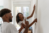 Happy African American couple hanging a picture on the wall while decorating their new home. Smiling and working together, enjoying teamwork, love, and joy in creating a cozy space