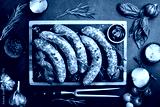 Raw beef sausages with rosemary and spices, ready to be grilled. On a wooden cutting board. Close up.
