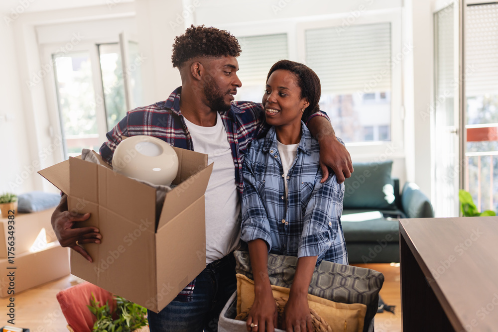 Happy African American couple smiling while unpacking boxes in their new home, enjoying a fresh start together after moving in.