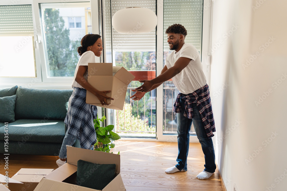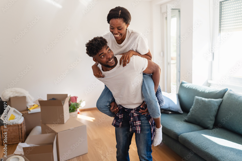 Joyful African American couple having fun while unpacking in their new home, man giving woman a piggyback ride surrounded by moving boxes.