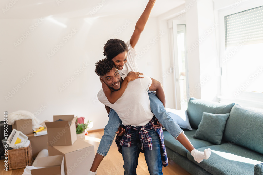 Cheerful African American couple having fun while unpacking in their new home, woman celebrating on man’s back surrounded by moving boxes and sunlight