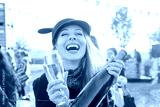 Happy young woman drinking wine having fun outdoors