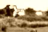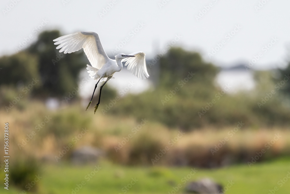 Little egret Egretta garzetta flying over green field