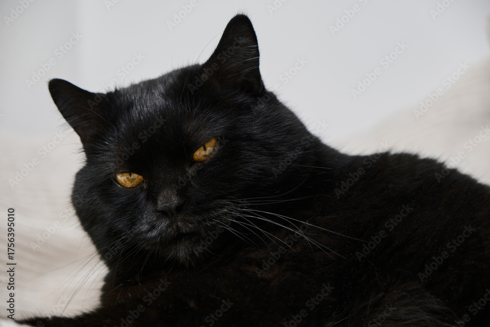 Close-up portrait of Salem, a large black cat with striking yellow eyes. Luxurious, elegant feline gaze, showcasing beauty, mystery, and calm sophistication.