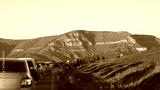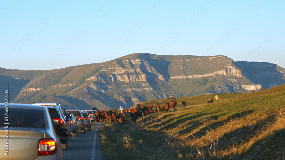 A traffic jam on a mountain road due to a herd of cows being driven to pasture. Many cows in front of a line of cars.