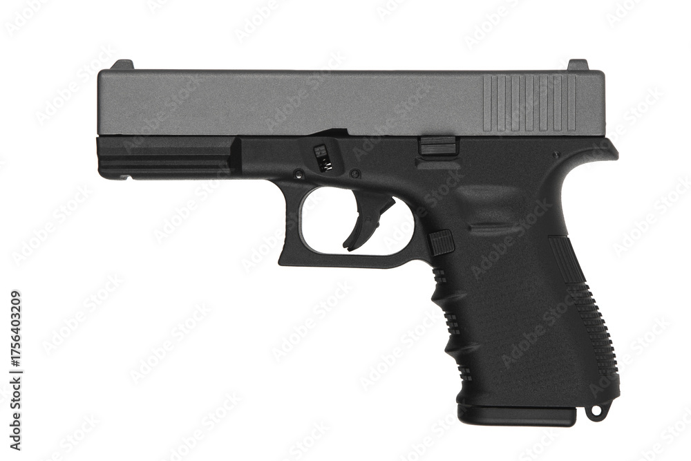 A modern black semi-automatic pistol with a gray slide, isolated against a white back
