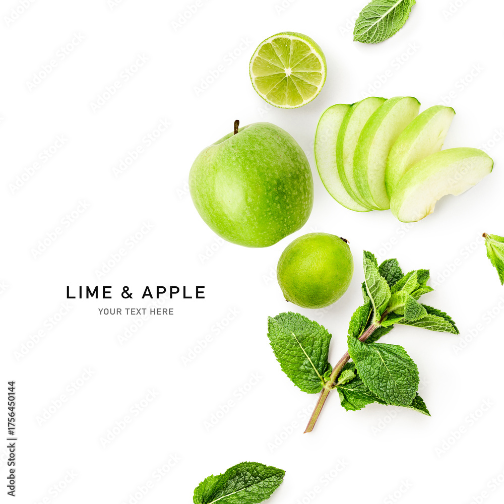 Green apple, lime and fresh mint composition isolated on white background. Modern minimalist design