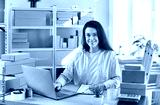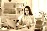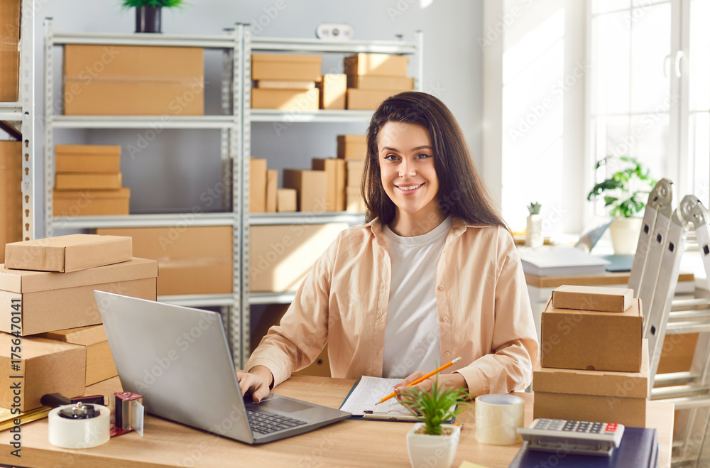 Portrait of a woman working in a warehouse, conducting inventory using laptop. She is surrounded by storage boxes, parcels and packages, showcasing efficiency in managing the warehouse inventory.