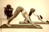Women engage in a yoga practice, performing different poses to improve flexibility, strength, and mindfulness. This healthy activity promotes physical and mental well-being while encouraging a