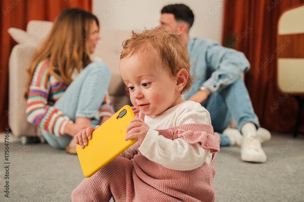 A curious toddler engaged in playful exploration with a bright yellow smartphone as family members enjoy quality time together in a cozy atmosphere, sharing laughter and joy in their interactions.