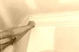 Hands work carefully to install crown molding in freshly painted room during home renovation efforts.
