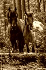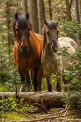 Dun Konik and brown Hucul horses standing together in a forest surrounded by trees and green moss