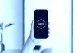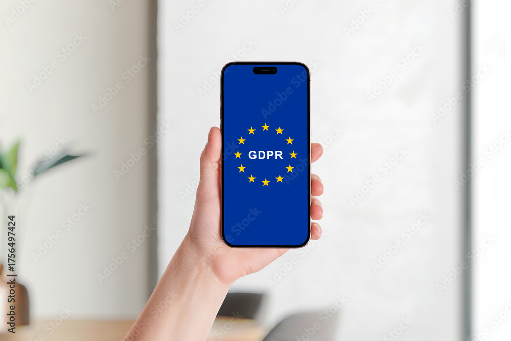 Hand holding smartphone displaying European Union flag and GDPR logo symbolizing data protection, privacy rights, and European digital regulations