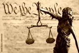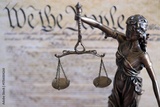Lady Justice bronze statue with scales on background of US Constitution page close up. Lawsuit and punishment in United States