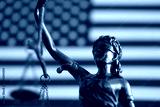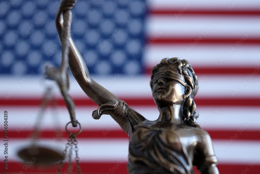 Law and Justice in United States of America, statue of Lady Justice with USA flag in background, selective focus