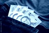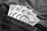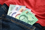 Thai baht money bills in denims pocket close up. The concept of fashion and wealth