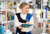 Female manager of a hardware store keeps track of goods on supermarket shelves