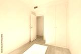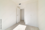 A bright, empty room with white walls and light wooden flooring. A closed door and a closet are visible. Natural light enters through a window.