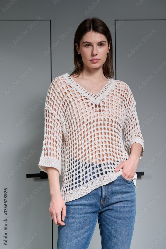 A girl model in stylish clothes poses on a gray background.