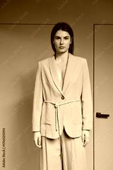 A girl model in stylish clothes poses on a gray background.
