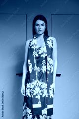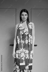 A girl model in stylish clothes poses on a gray background.
