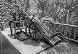 Antique sugarcane crushing machine and a wooden cart loaded with fresh cane stalks in a tropical outdoor setting