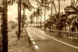 Tropical travel scenery: an empty, wet road flanked by green grass, yellow flowers, and tall, slender coconut palms