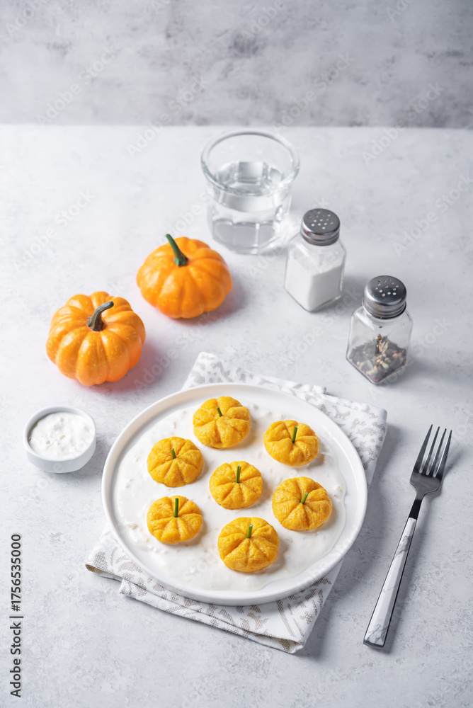 Fresh prepared pumpkin gnocchi in the form of pumpkin with garlic cream sauce