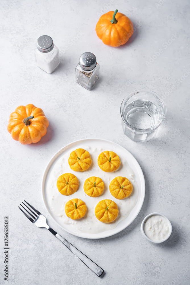 Fresh prepared pumpkin gnocchi in the form of pumpkin with garlic cream sauce
